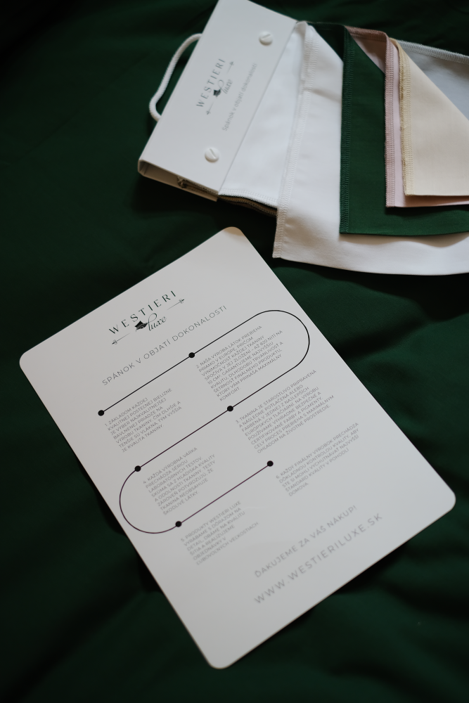 Dnes túto víziu spánku posúvame ešte ďalej s našou novou kolekciou Westieri Luxe – exkluzívnou posteľnou bielizňou, ktorá premení každú spálňu na oázu pokoja a elegancie. Každý detail našich obliečok je premyslený do poslednej nitky. Používame len tie najjemnejšie materiály, ako je 100 % bavlnený satén, a naša bielizeň sa pýši extrémnou hustotou tkania – 820 nití na 10 cm², čo jej poskytuje jedinečnú jemnosť, priedušnosť a dlhú životnosť.